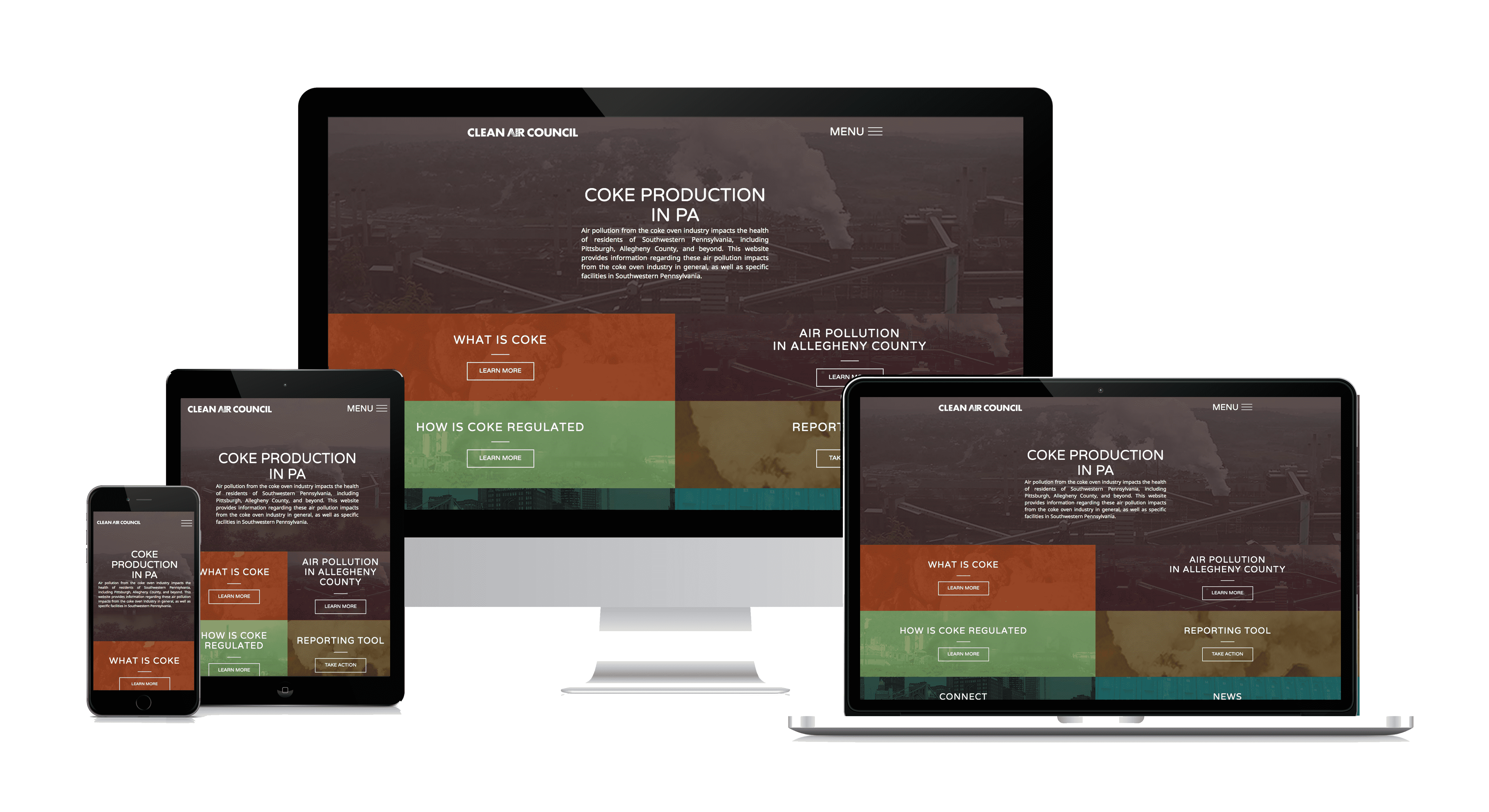 Clean Air Council is Philadelphia’s oldest environmental non-profit. In developing ‘pacokeovens.org’, the Council wanted to provide air pollution information from the coke oven industry that impacts the health of residents of Southwestern Pennsylvania, including Pittsburgh, Allegheny County, and beyond.  Specifically they wanted to incorporate a ‘reporting tool widget’ for residents to pinpoint locations on a map, to report air pollution across the state and PA counties.