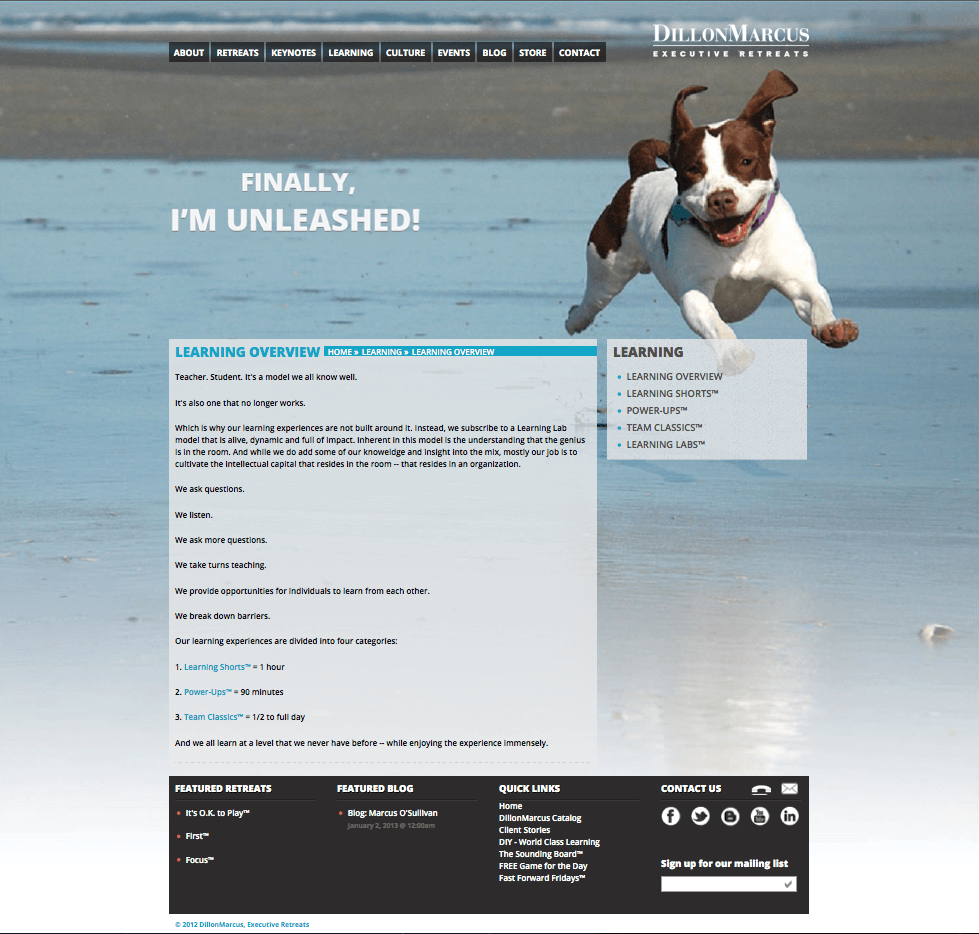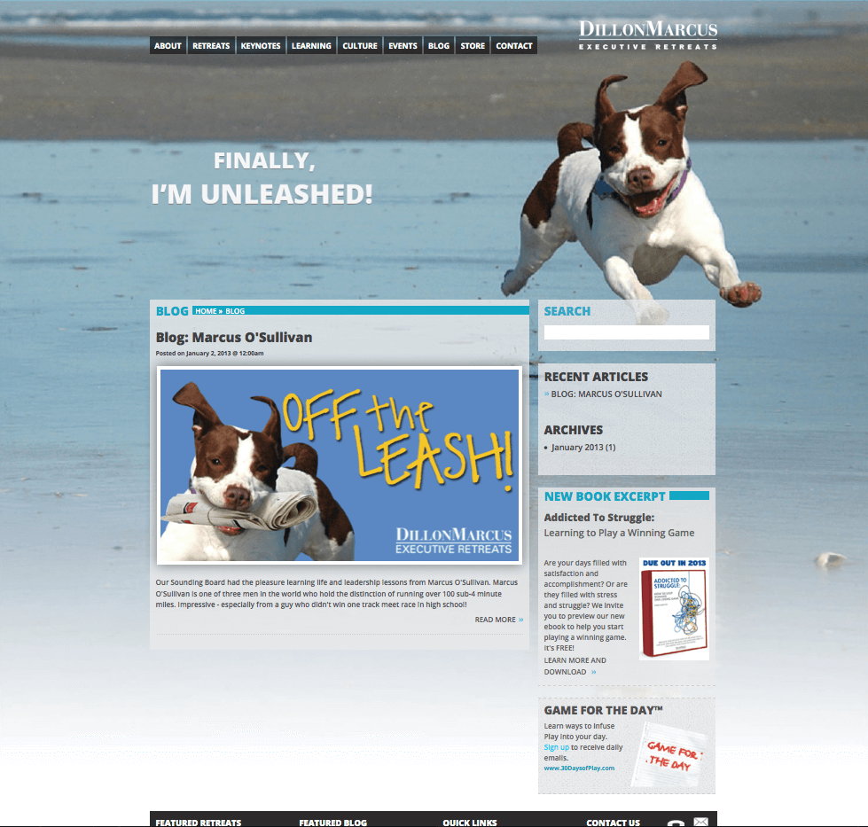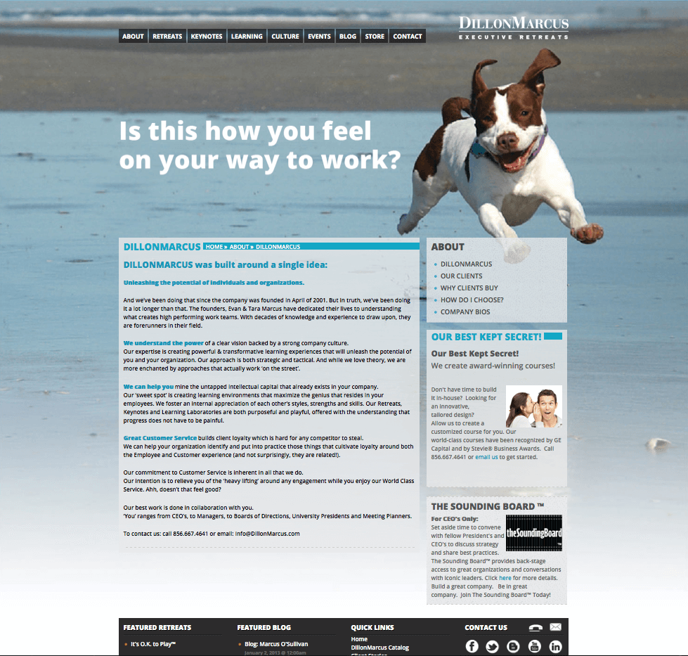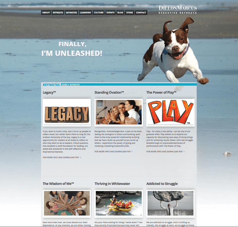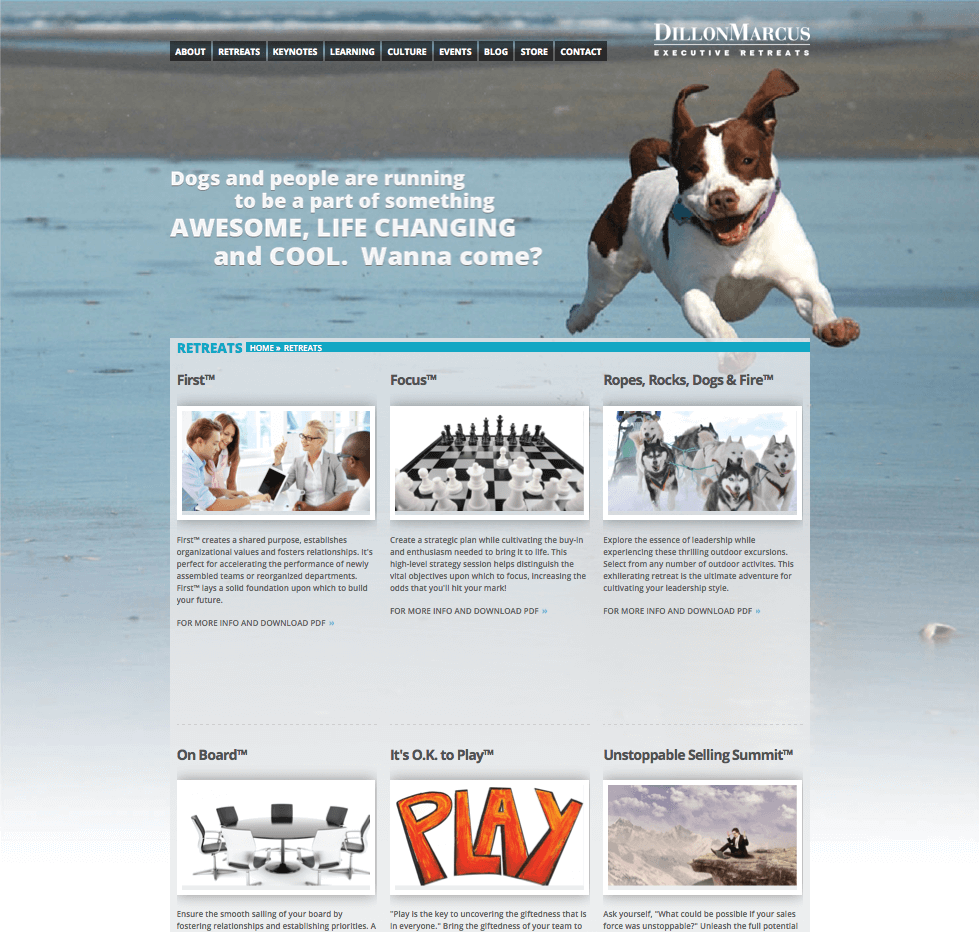 Dillon Marcus Executive Retreats already had a website, but was in need of a fresh, polished look – a new perspective. A + L Development redesigned the client’s website from top to bottom incorporating a custom CMS. In addition, an SEO upgrade was initiated with links to social media and the addition of a blog.