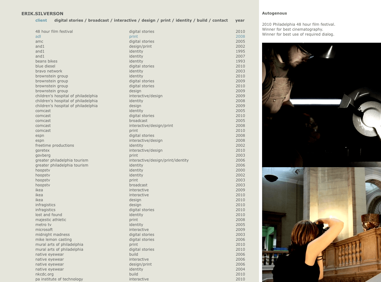 Multitalented visual artist Erik Silverson wanted a fast, simple online site to showcase his large portfolio of freelance work. His content-heavy online portfolio also needed to be both visually and technically compatible with the iPhone, iPad, Android and other mobile devices. His vision was to emphasize speed and functionality over user experience.
