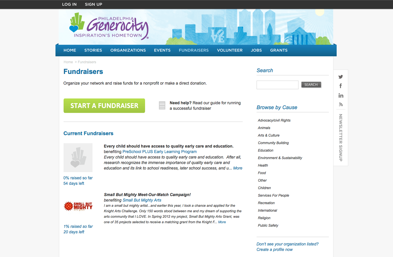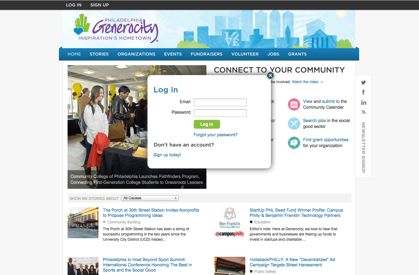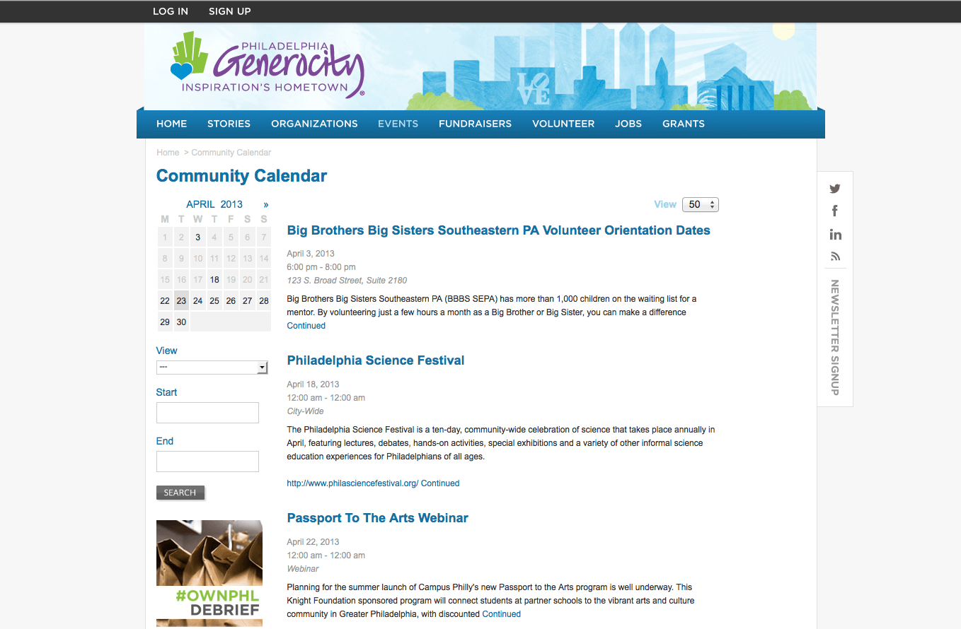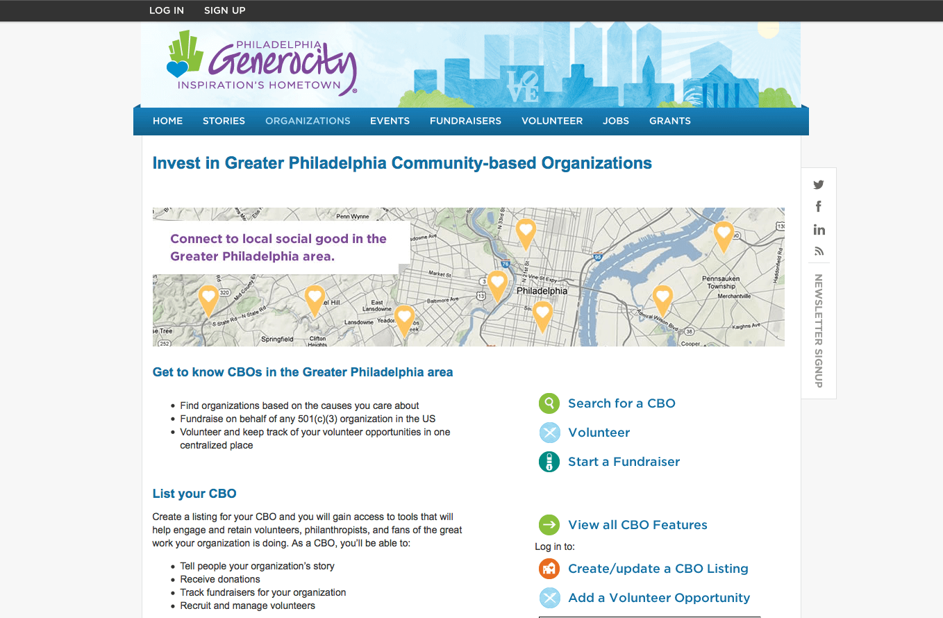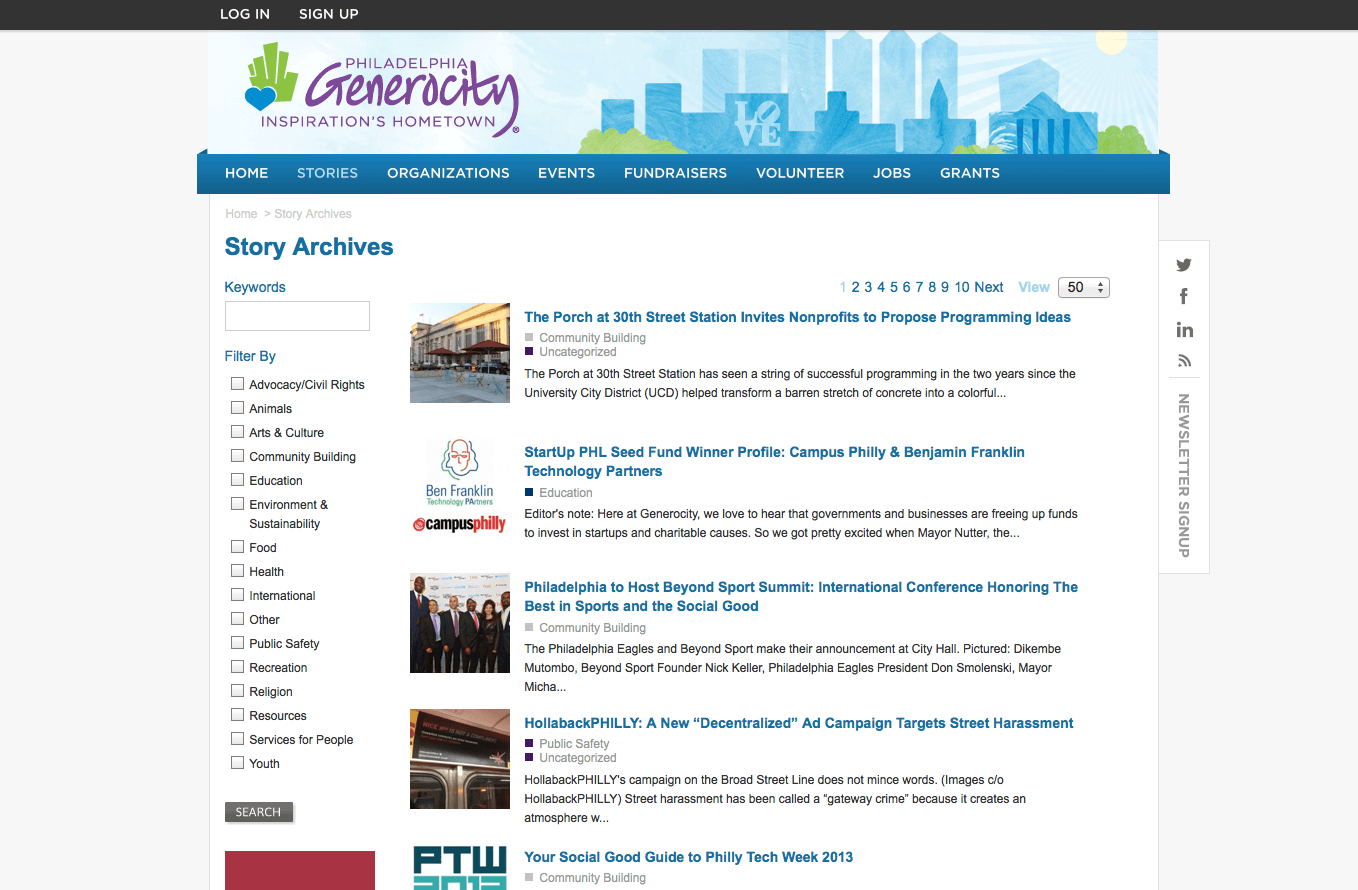 Generocity.org is a ‘platform for social good in Greater Philadelphia’. A place to stay informed, get connected and be involved in Community Based Organizations (CBOs). The client needed a way for users to search for grant opportunites along with job and volunteering positions while having the capability to create fundraising events and generate news stories. Generocity.org’s website concept was a ‘work-in-progress’ upon A + L involvement and specific projects were built upon an established framework.