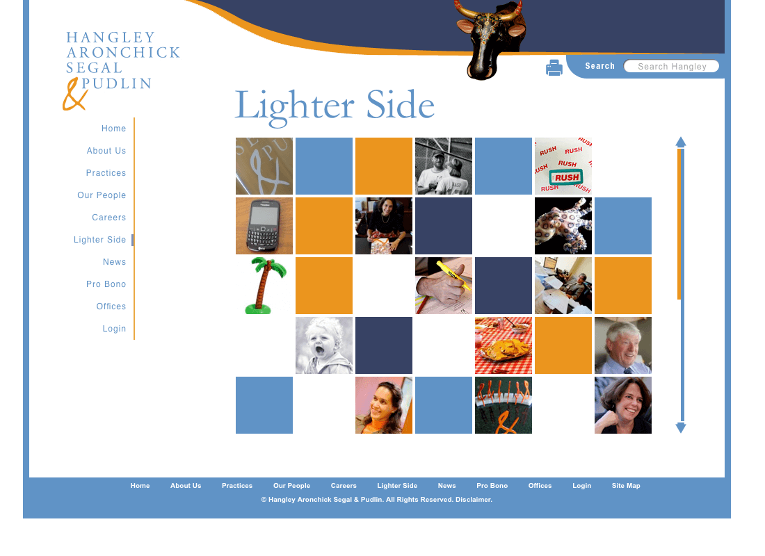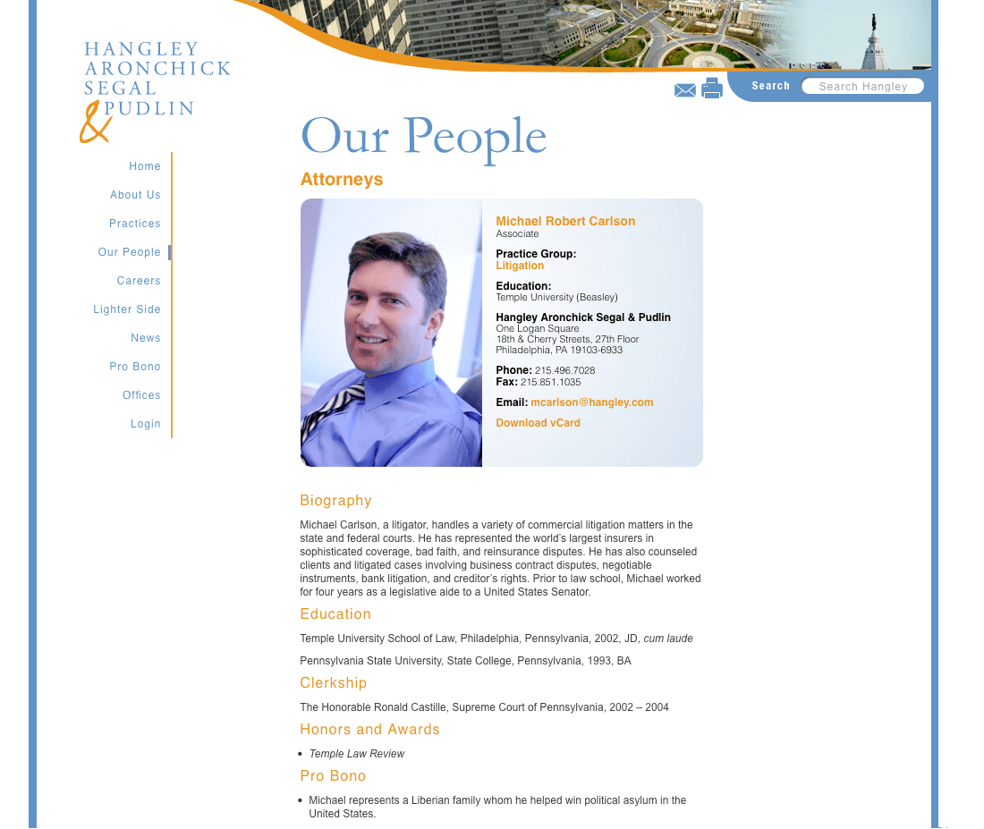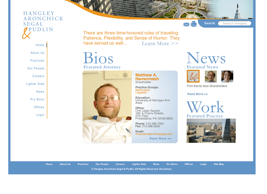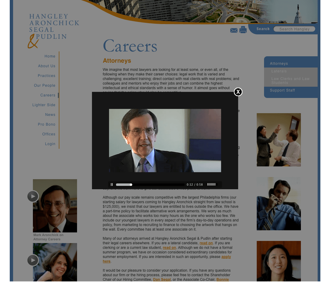 Hangley, Aronchick, Segal, Pudlin & Schiller is a multi-faceted law firm offering a full range of legal services to clients throughout the world. A practice that prides itself on the qualifications and personalities of its attorneys, the firm wanted a website that could handle frequent updates to attorney profiles, video and photo galleries, and special features.