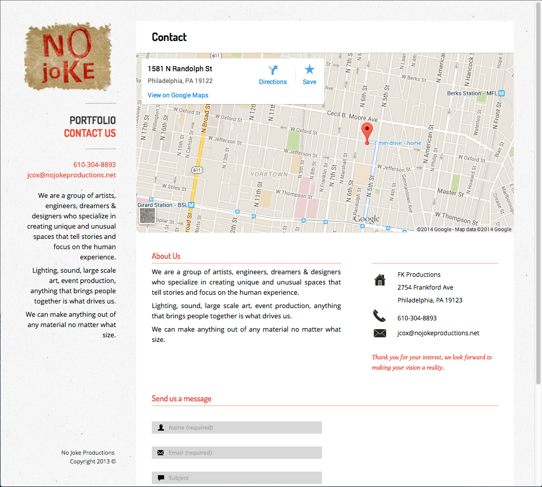 No Joke Productions is a group of artists, engineers, dreamers and designers who specialize in creating unique and unusual spaces that tell stories and focus on the human experience. They offer lighting, sound, large scale art and event production services.