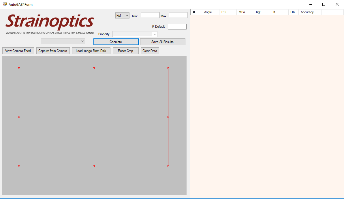 A + L Development (A + L) helped develop and create an Auto GASP software application for use in the Windows Operating System. This Windows based application captures and converts an analog to digital video stream (using a StrainOptics camera device) in order to capture an image, to detect stress fractures. When capturing, image calculations are made for angle of lines with constant (K) to calculate strain on glass. The user can enter a constant/variable in input field and calculations are processed and then save the image to desktop.